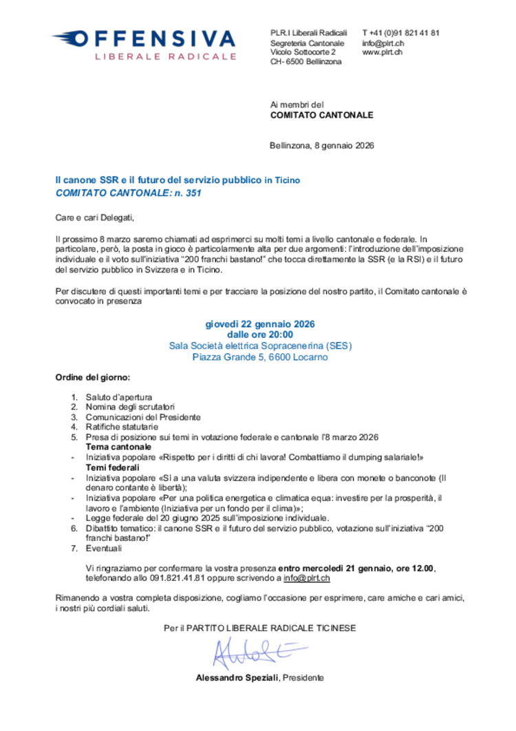 Giovedì 22 gennaio 2026, alle ore 20.00, presso il Salone SES di Locarno, si terrà il Comitato cantonale PLRT.